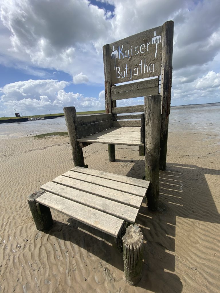 Foto Belinda Helmert, Skulpturenpfad, Kaiserthron. Auch dieses Objekt hat nichts mit der Genesis gemein, sondern verweist auf den legendären Wikinger-Kaiser, der im 13. Jahrhundert die Küste und das Land Dangast eroberte. Der Kaiserstuhl Butjathas steht im Watt vor dem Kurhausstrand.
