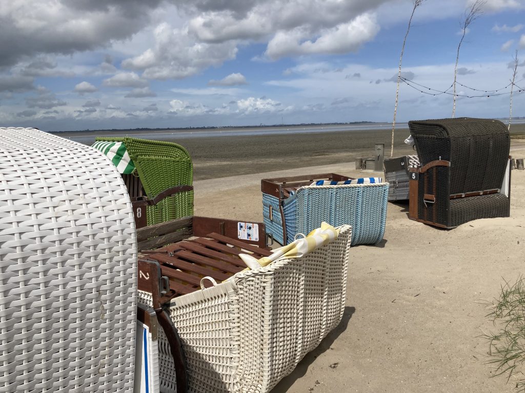 Foto Bernd Oei: Strandkörbe am Dangaster Wattmeer. Ebbe und Flut formten über Jahrtausende eine der fruchtbarsten Naturlandschaften der Welt: das Wattenmeer. 10 bis 12 Millionen Zugvögel pro Jahr durchziehen die weltweit größte zusammenhängende Schlick- und Sandwattfläche.