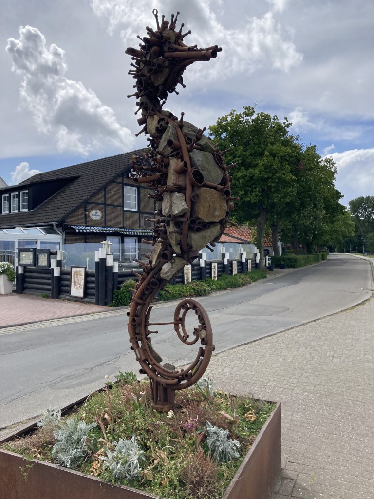 Foto Bernd Oei: Dangaster Seepferdchen-Skulptur von der Russin Antonina Fatkhullina; es entstand 2018 beim Internationalen Skulpturensymposium und erinnert an die historische Bedeutung. Standort Rennweide nahe des Radziwill-Hauses, früher Rennbahn bis in die 50 er Jahre unweit des Meeres.