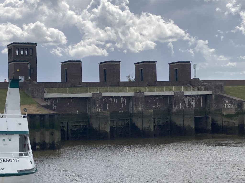Foto Bernd Oei: Dangaster Schleuse. Sie erinnert von der Shilkouette an das Reichsparteitaggelände. Dunkle Wolken ziehen auf.