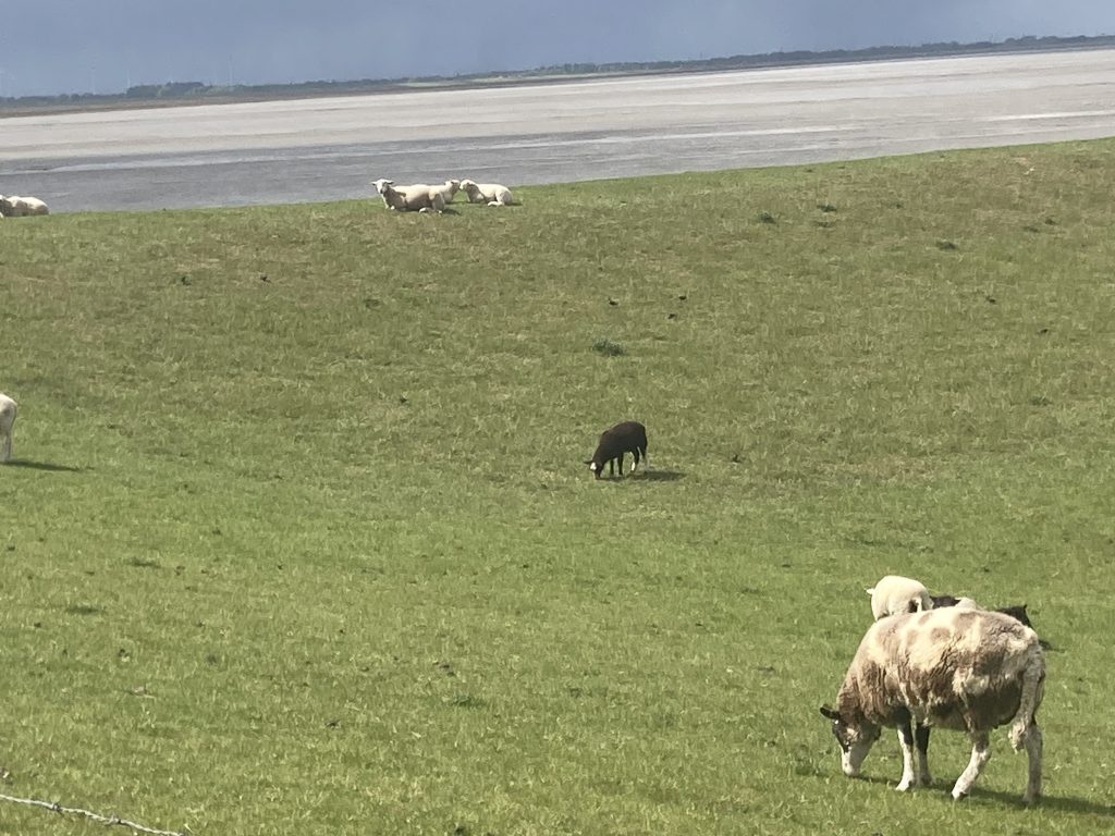 Foto Bernd Oei: Grasende Schafe auf Dangaster Düne. Friedliche Lämmer, die zur Schlachtbank geführt werden? Oder einfach nur Herdentier und Wiederkäuer.