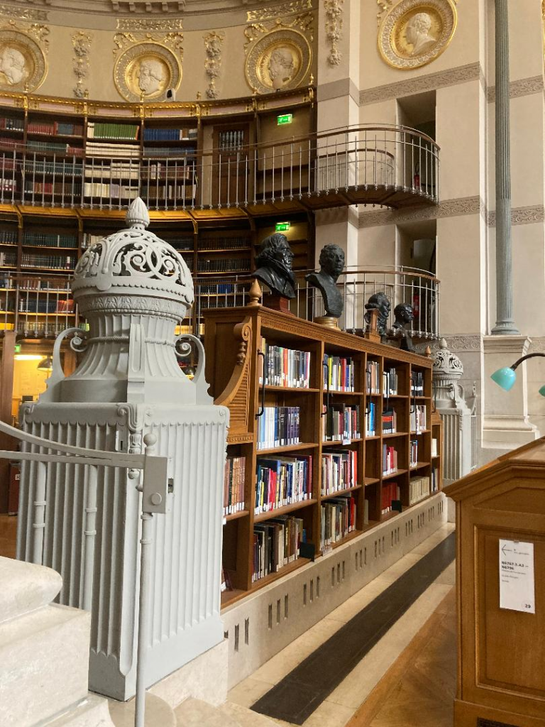 Foto Belinda Helmert: Lesesaal Heni Labrouste. Während der Corona-Epidemie wurde der Saal modernisiert, die Bibliothek teilweise umgestaltet. https://www.detail.de/de_de/atelier-bruno-gaudin-saniert-franzosische-nationalbibliothek?srsltid=AfmBOop-NSGQ1wsDA_VQi3vjXDn0F7pv1MAoC5hi5sHOn5lrn5S2zOZp