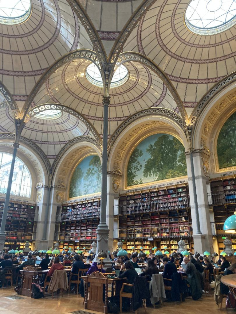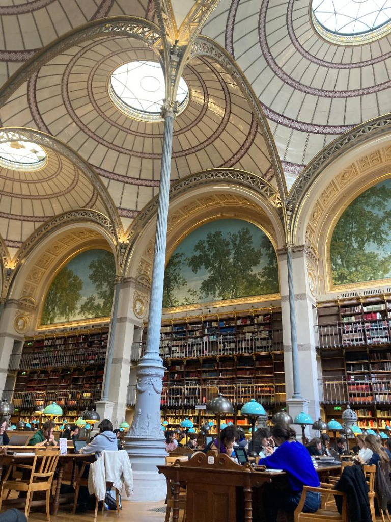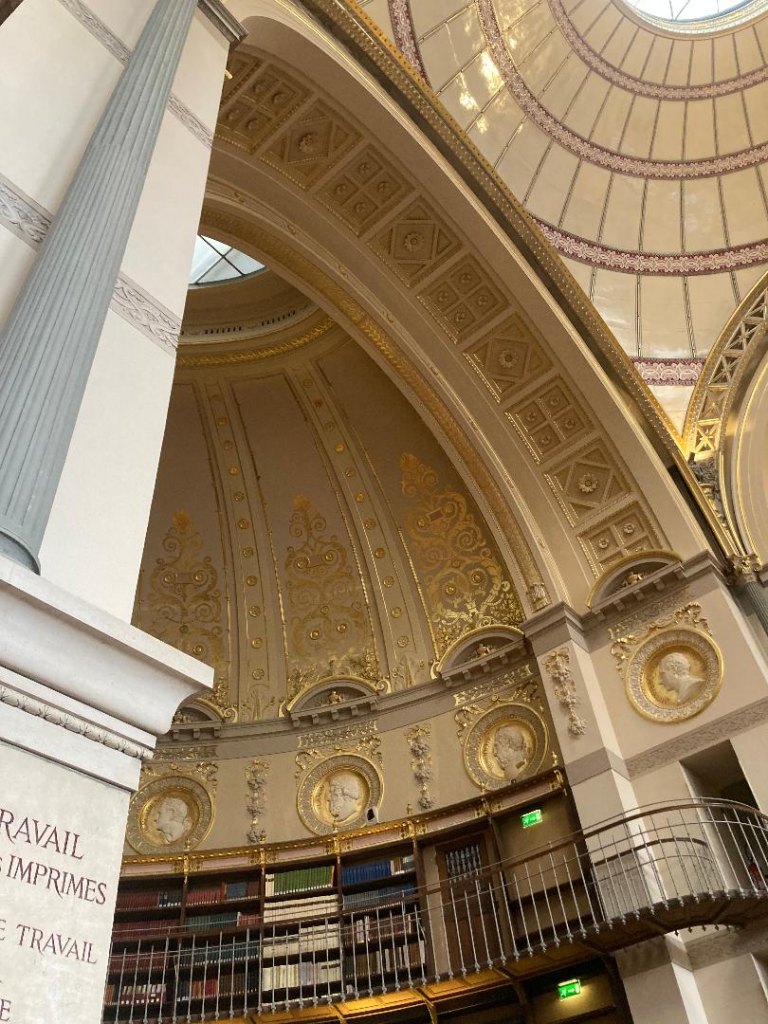 Foto Belinda Helmert: Lesesaal der alten französischen Nationalbibliothek. https://www.deutschlandfunkkultur.de/alte-pariser-nationalbibliothek-lesesaal-in-neuem-glanz-100.html