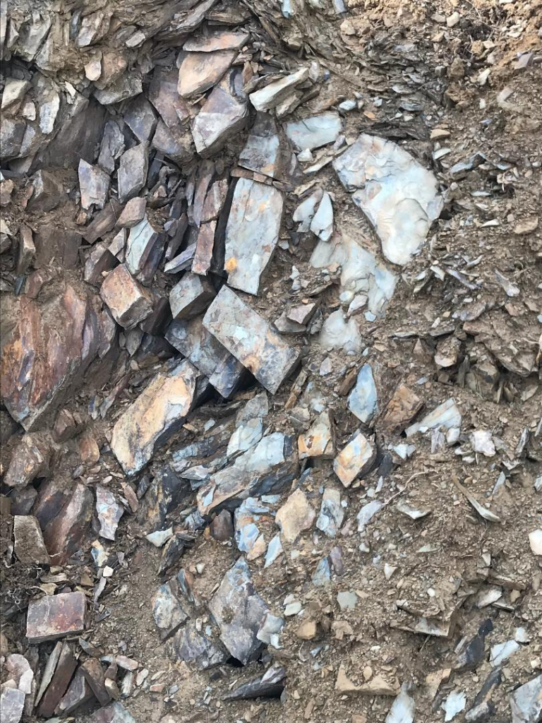 Foto Bernd Oei: blaues Gestein, Detail am Rammelsberg nahe Goslar. Azurit oder Kupferkarbonate kommen Erzabbaustätten vor, während der Rammelsberg selbst für seine Buntmetalle (Kupfer, Blei, Zink, Silber, Gold) bekannt ist und für Goslars Reichtum verantwortlich zeichnete.