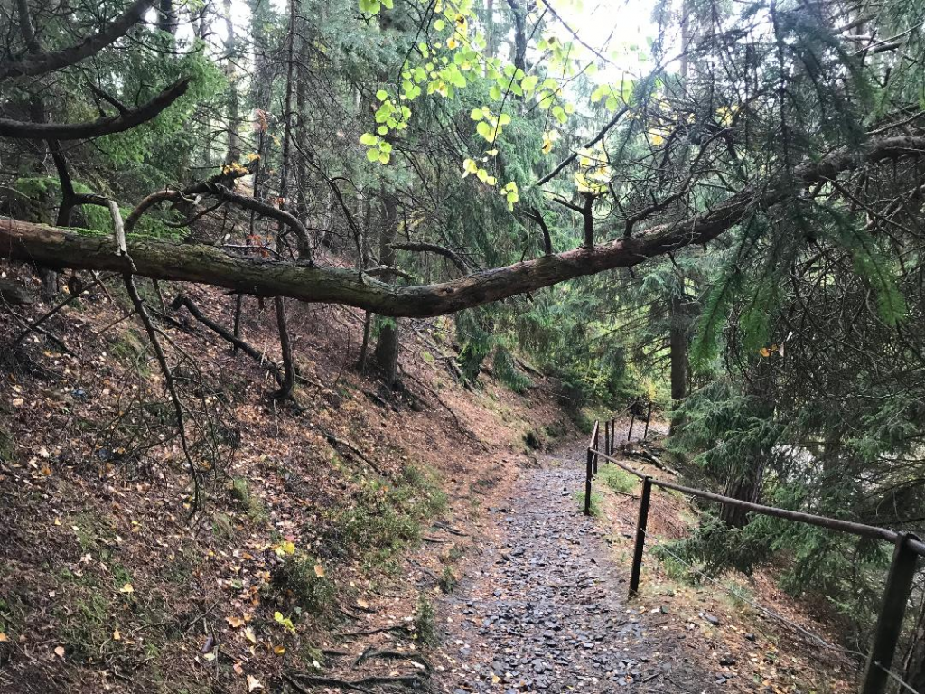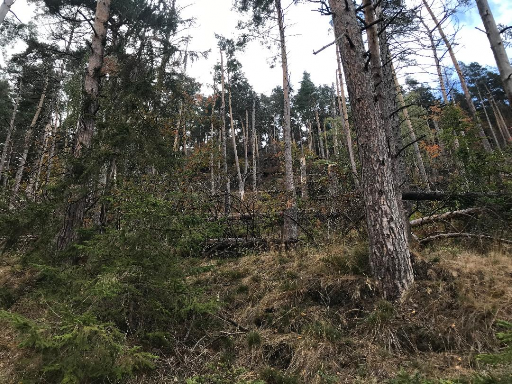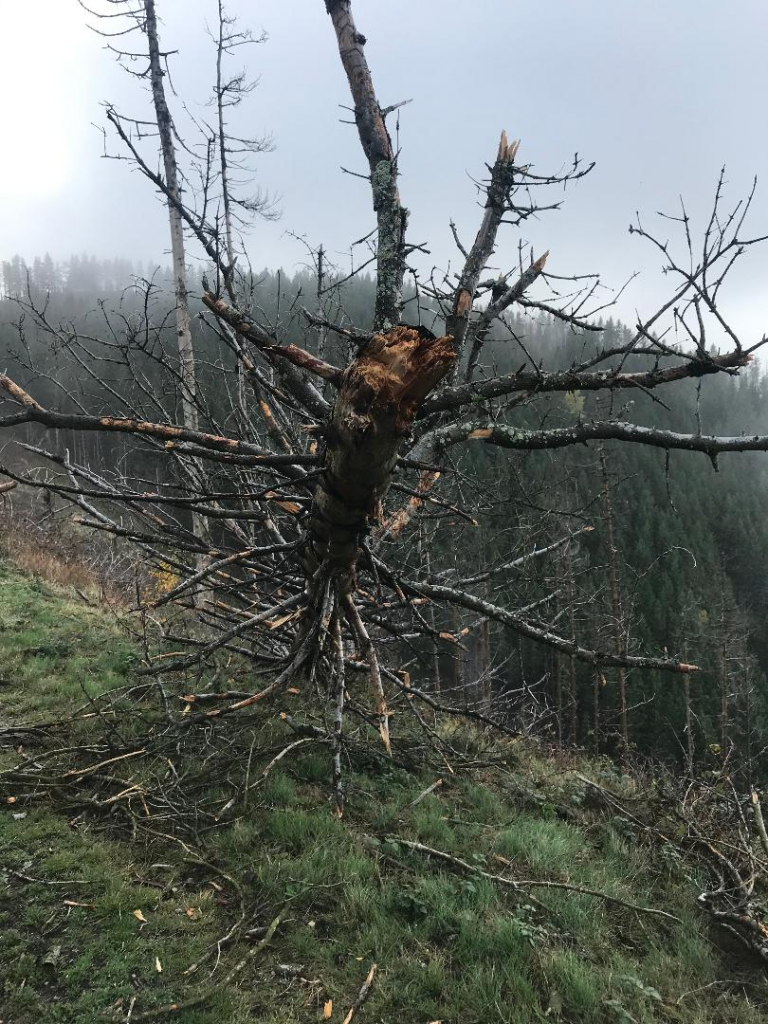 Foto Bernd Oei: gestürzter Baum am höchsten noch zugänglichen Ausgangspunkt auf dem Rammelsberg, Mittelgebirge um die 635 m maximale Höhe.