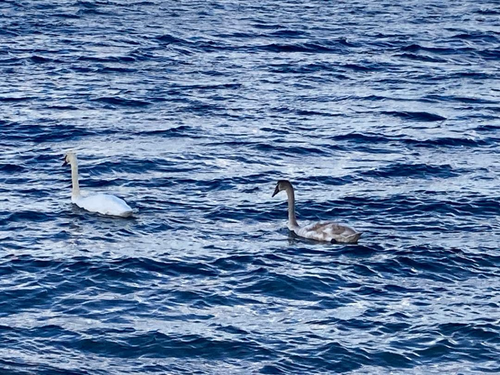 Foto Bernd Oei: Schwanenverkehr auf der Ostsee, Niendorfer Strand. Die Schwanentreue kann bis zum 40. Lebensjahr andauern und damit bis zum Tod.