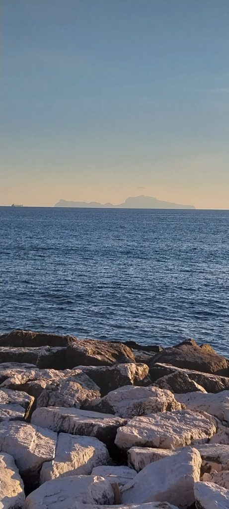 Foto Malte Godglück: Neapel, Blick von der Uferpromenade Lungomare auf Capri, weniger als 17 Seemeilen und 1 Stunde Fahrzeit entfernt.