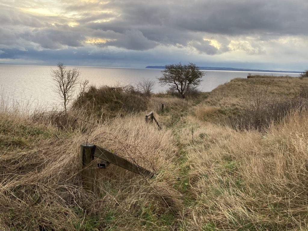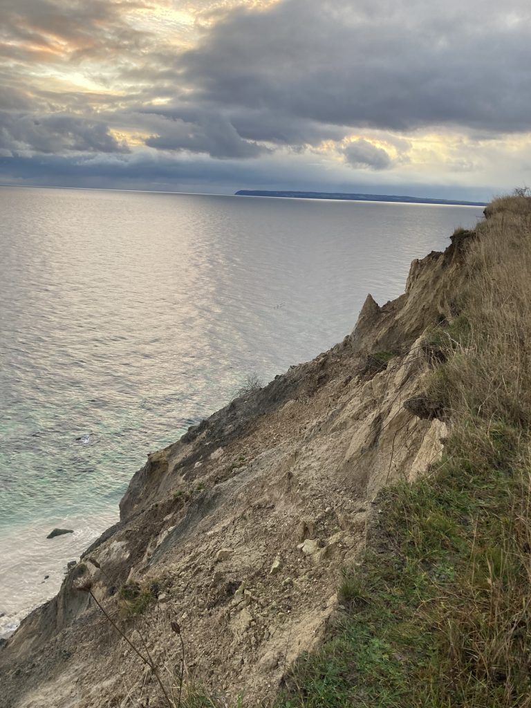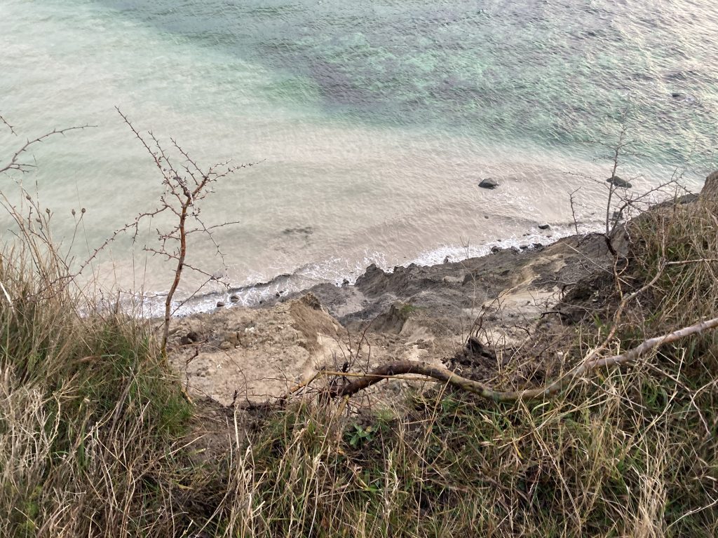 Foto Bernd Oei: Rügen, Steilküste bei Kap Arkona, die für die Öffentlichkeit wegen abbrechender Erde nicht mehr zugänglich ist. In der Nähe befand sich die Jaromarsburg vom 9.-12. Jahrhundert, bis sie von den Dänen im Zuge der Christianisierung zerstört wurde. Bis heute finden noch Grabungen statt. Da der Landabbruch jährlich über 10 Meter beträgt, muss der Felsen wie der Küstenverlauf früher ganz andere Formen besessen haben.